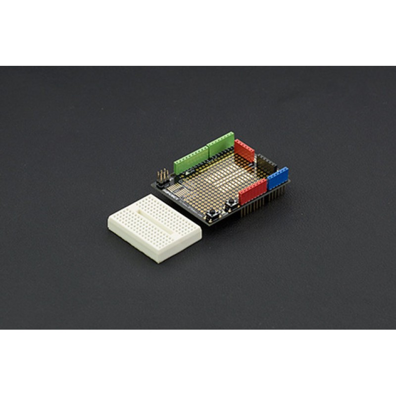 This is the very first prototyping shield for Arduino in the market since 2010.  It comes with a prototyping area that you can solder or switch with other components,  it also comes with a mini Arduino breadboard that can stick on the prototyping shield that makes the project look tidy and fancy.